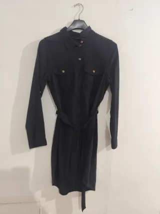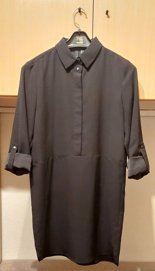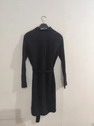 Vestido tipo camisero con botones hasta la cintura, color negro de manga larga y bolsillos en los laterales. Composición 100% poliéster.