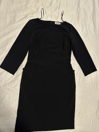 Elegante vestido negro de corte ejecutivo. - Diseño de manga larga. - Cremallera en la espalda. - Tirantes finos.