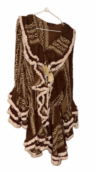 Vestido asimétrico con un estampado étnico en tonos marrones y beige. Presenta detalles de flecos y borlas que le dan un toque bohemio. • Largo: 84-94cm. • De hombro a hombro: 40cm. - Diseño asimétrico. - Estampado étnico. - Adornos de flecos y borlas.