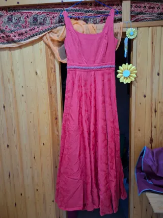 Elegante vestido largo de color rosa, perfecto para cualquier ocasión especial. Su diseño fluido y con volantes lo hace muy favorecedor. Le falta un botón del hombro el resto está perfecto - Diseño de tirantes. - Cintura marcada. - Falda con varios volantes.