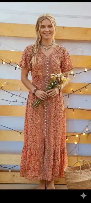 Vestido largo con un bonito estampado floral en tonos naranja y marrón. Presenta un diseño de espalda cruzada con cordones y un detalle de borlas. - Escote en V. - Seda 70% Poliéster 30% - Mangas cortas acampanadas. - Abertura en la falda. - Cintura marcada.