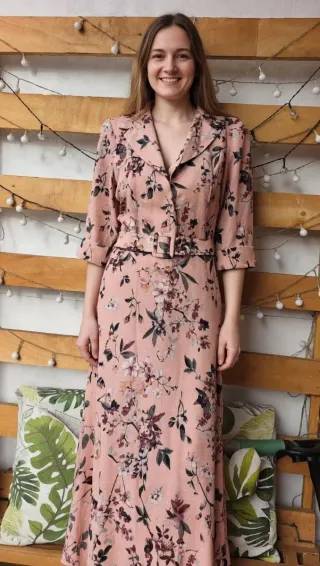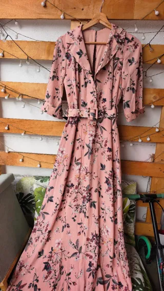Vestido largo con un bonito estampado floral. El diseño presenta un cinturón a juego que realza la silueta. - Manga corta con vuelta. - Cuello solapa. - Estampado floral sobre fondo rosa.