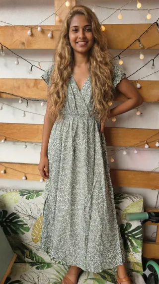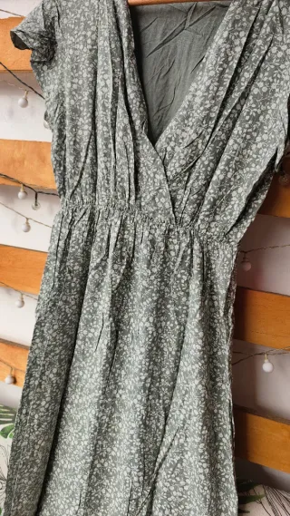 Vestido largo con un bonito estampado floral en tonos verdes y blancos. Presenta un diseño elegante y cómodo. - Manga larga. - Cuello en V con detalle de encaje. - Puños y bajo con detalles de encaje.