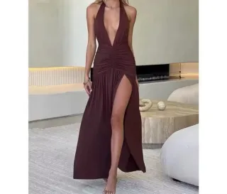Elegante vestido largo de fiesta con un diseño único. - Color base marrón con detalles dorados. - Corte halter y escote pronunciado. - Falda larga con textura arrugada.