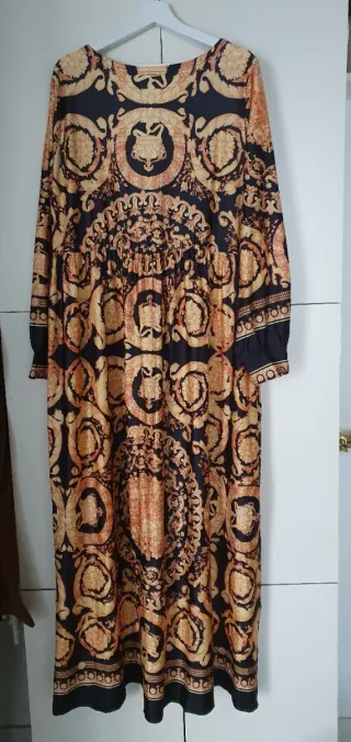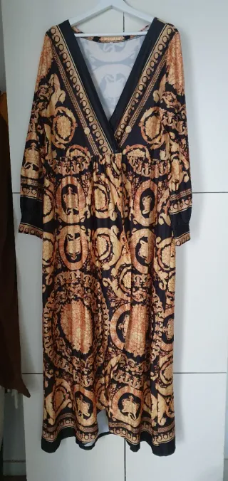 Elegante vestido largo con un llamativo estampado barroco en tonos dorados y negros. Presenta un escote en V y mangas largas. - Diseño con estampado barroco. - Escote en V. - Mangas largas.