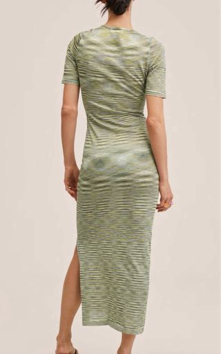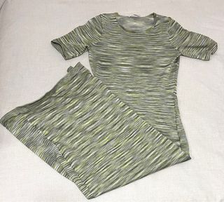 Vestido largo entallado de manga corta y cuello redondo. Diseño entallado súper favorecedor y cómodo. Abertura lateral. Color verde con estampado de rayas Usado dos veces, como nuevo Me costó 60€
