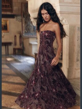 Elegante vestido largo con un estampado llamativo. - Diseño sin tirantes. - Estampado floral y paisley. - Corte acampanado.