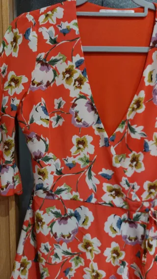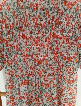 Vestido con estampado de flores y pájaro. - Diseño con escote en V. - Mangas largas abullonadas. - Estampado floral en tonos rosas y blancos. - Detalle de pájaro con flores en la parte superior. Prácticamente nuevo...