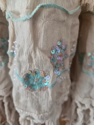Vestido vaporoso con detalles bordados y flecos. - Diseño con bordados florales en tonos turquesa y blanco. - Mangas largas con flecos. - Detalle de cordones con borlas en el escote. - Bajo con puntilla y flecos. Talla unica s ,xl