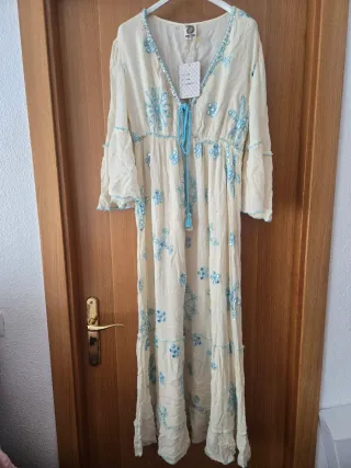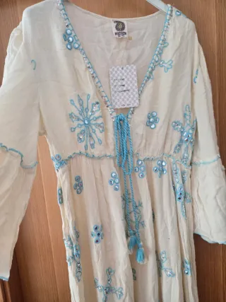 Vestido largo con un bonito diseño bordado. - Escote en V. - Mangas acampanadas. - Cordón ajustable en la cintura con borlas. - Detalles de lentejuelas y espejos. Talla unica ,s ,xl