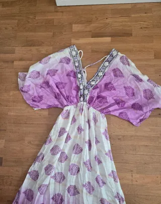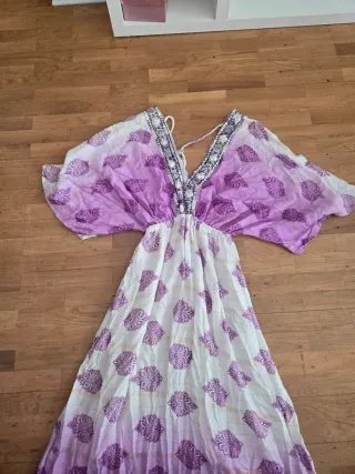Vestido largo con un bonito estampado degradado en tonos morados y blancos. Ideal para un look bohemio y fresco. - Diseño con escote en V. - Mangas tipo mariposa. - Detalle de pedrería en el escote. - Cordones para ajustar en la espalda ,talla unica , s xl.