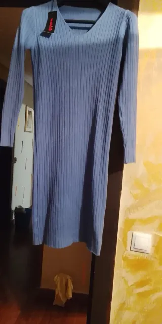 Vestido de punto fino con cuello en pico. - azul - Manga larga. - Diseño acanalado vertical. - Etiqueta de la marca visible. - Elástico - Talla única