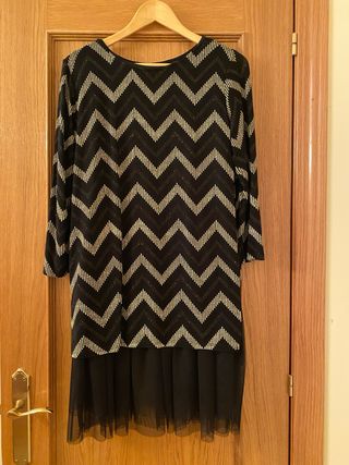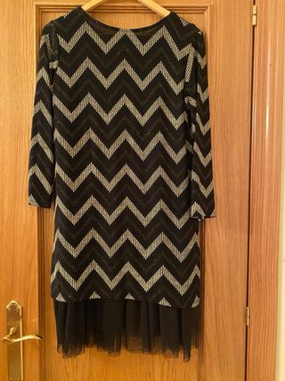 Elegante vestido negro con un llamativo estampado de zigzag en tonos plateados. La parte inferior cuenta con un detalle de tul que le da un toque especial. - Diseño de zigzag plateado sobre fondo negro. - Falda con capa de tul. - Manga larga.