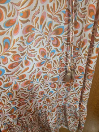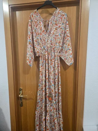 Vestido largo con un llamativo estampado paisley. - Diseño con escote en V y lazada. - Mangas largas acampanadas. - Falda con volantes y volantes. - Abertura en la cintura. Talla unica ,s xl