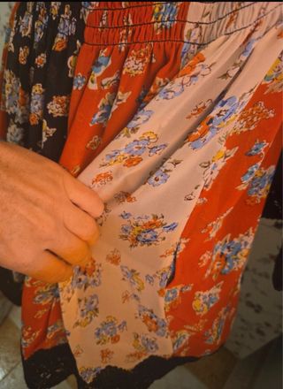 Vestido de la marca Holy Preppy con un diseño patchwork floral y detalles de encaje, lleva bolsillos. - Diseño de hombros descubiertos. - Mangas largas. - Cintura elástica fruncida. - Bajo con detalle de encaje negro.