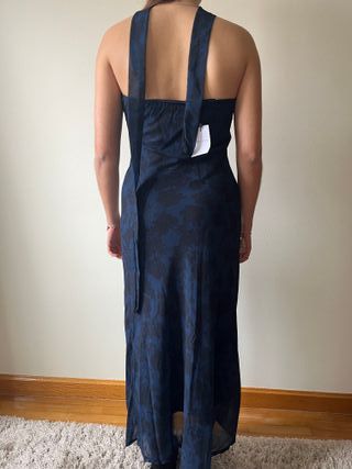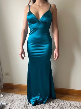 LO VENDO PORQUE SE ME PASÓ LA FECHA DE DEOLUCIÓN - Diseño largo y ajustado. - Escote pronunciado en V. - Tirantes finos. - Tejido satinado con brillo.