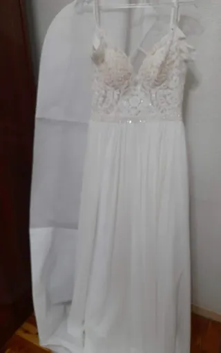 Elegante vestido de novia de la diseñadora Ainhoa Salcedo. Un diseño que combina detalles delicados con una silueta fluida. - Cuerpo con encaje y pedrería. - Falda larga y vaporosa. - Tirantes finos. Vendo también can can y velo con más diposas de encaje corpiño de sujetador