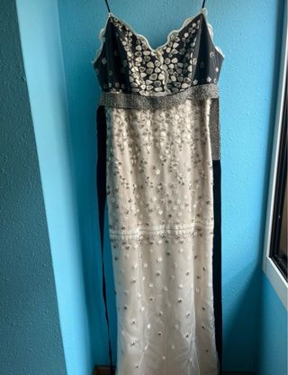 Elegante vestido largo de Isabel Sanchís, perfecto para eventos especiales. Combina detalles de pedrería y encaje. - Diseño con tirantes finos. - Cuerpo superior con pedrería. - Cintura adornada con detalles brillantes. - Falda larga con motivos florales bordados. Con tul y forro interior. Etiqueta talla 44, pero talla pequeño.