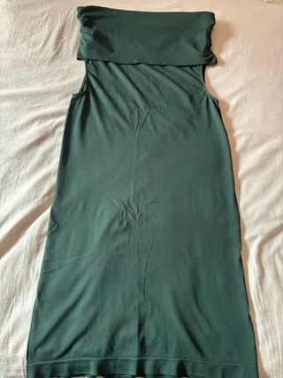 Vestido ajustado con un diseño original en el escote. - Escote tipo palabra de honor. - Sin mangas. - Largo hasta la rodilla. - Bajo con acabado acanalado. - Solamente utilizado una vez