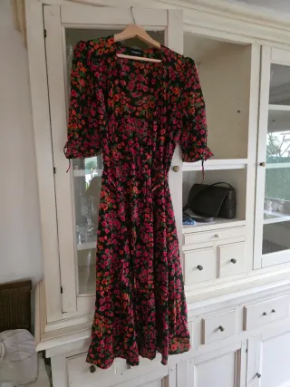Vestido largo con estampado floral y forro interior. Usado una vez para una boda, precio en tienda 180€ - Diseño con escote en V. - Mangas cortas con volantes. - Bajo asimétrico. - Cintura elástica.