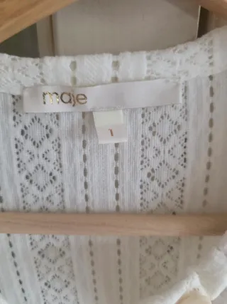 Vestido blanco de la marca Maje. Presenta un diseño delicado con detalles de encaje y botones. - Manga larga. - Cuello redondo. - Largo hasta la rodilla.