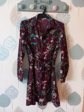 Vestido de manga larga con estampado floral en tonos burdeos y verdes. Incluye cinturón. - Cuello camisero. - Cierre de botones. - Cinturón a juego.