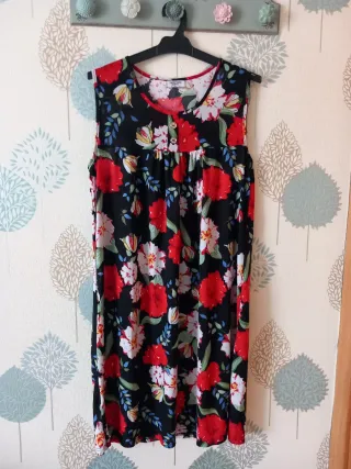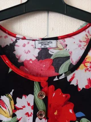Vestido sin mangas con estampado floral sobre fondo negro. Presenta un escote en V con ribete rojo y dos botones decorativos en la parte superior. Ideal para estar en casa o también para salir Talla M/L En perfecto estado