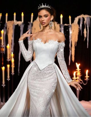 Elegante vestido largo de ceremonia, ideal para eventos especiales. - Diseño de corte sirena. - Mangas largas de encaje. - Escote Bardot. - Sobretrajes de satén. - Detalles de pedrería. ideal para bodas vestido novia galas eventos precioso 💕