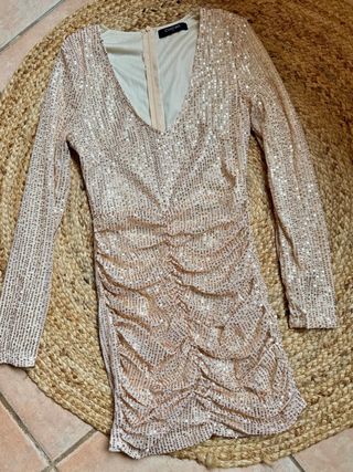 Vestido corto con lentejuelas brillantes. - Diseño con cuello en V. - Manga larga. - Fruncido en la parte delantera.