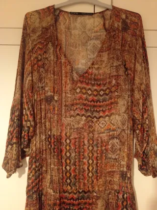 Vestido de gasa con un estampado vibrante y llamativo. Su diseño fluido lo hace muy cómodo y versátil. - Tejido ligero y vaporoso. - Mangas largas tipo murciélago. - Escote en pico. - Foto interior.