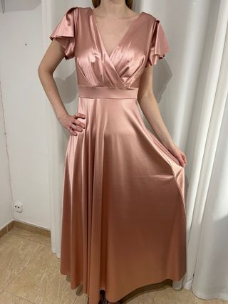 Vestido largo de manga corta color rosa champagne con tejido satinado y volantes en manga, cremallera en la espalda. Queda fenomenal, la tela se estira ligeramente, ideal para eventos, bodas, graduaciones, etc. Totalmente nuevo con etiqueta. Tiene un brillo y una caída preciosos. - Corte cruzado en el escote - Volantes en mangas - Cintura ajustada - Mínimo relleno en pecho para no transparentar Medidas: - Largo 142 cm - Cintura 33 cm 95% poliéster 5% elastano
