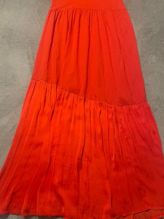 Vestido largo de color rojo, con un diseño de volantes en la parte inferior. - Tejido con brillo. - Cintura elástica.