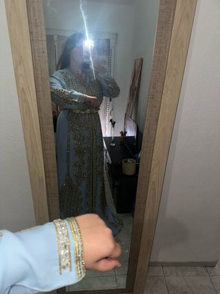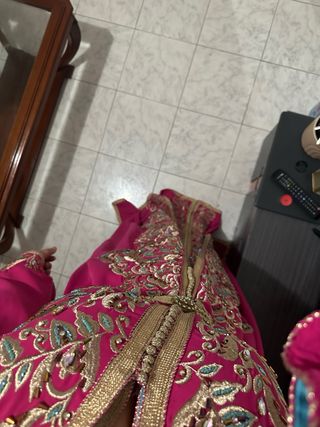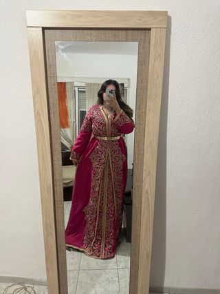 Elegante tekchita de estilo marroquí, perfecta para ocasiones especiales. Su diseño intrincado y los detalles dorados la hacen destacar. - Confección artesanal. - Bordados detallados. - Cinturón dorado incluido.
