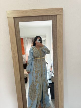 Elegante tekchita de estilo caftán marroquí. Diseñada con intrincados bordados dorados sobre una base azul. - Detalles bordados en dorado. - Corte fluido y largo.