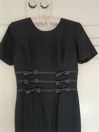 Elegante vestido negro con detalles de lazos. Largo midi. Puesto en dos ocasiones. Pequeño corte en un lateral. Medidas: hombros 38cm, pecho 43 cm, largo104cm - Diseño de manga corta. - Tres filas de lazos decorativos en la cintura. - Corte recto.