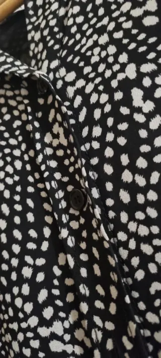Vestido corto con estampado de puntos blancos sobre fondo negro. - Diseño tipo camisa. - Manga larga. - Caída fluida - Falda vuelo con movimiento. - Tejido ligero