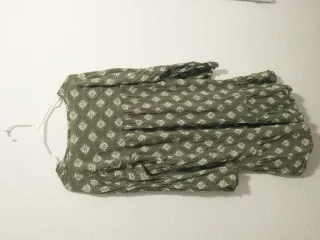 Vestido de corte fluido con estampado de flores pequeñas en tonos verdes y blancos. Ideal para un look casual o arreglado. - Escote cruzado. - Cintura elástica. - Mangas largas abullonadas. - Falda con volantes.