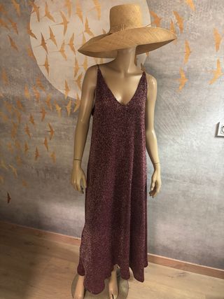 Precioso vestido largo con destellos de glitter, ideal para ocasiones especiales. ✨ - Diseño con tirantes finos cruzados en la espalda. - Corte amplio y favorecedor. - Tejido brillante y elegante.