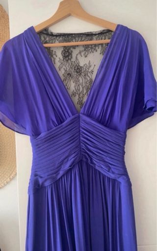 Elegante vestido largo de la marca BCBG. - Color morado vibrante. - Detalle de encaje negro en la espalda. - Diseño con fruncido en la cintura. - Mangas cortas tipo mariposa. Espectacular! Autentico Usado una vez perfecto stado Elegante y especial Cremallera al lado Precio original 350€