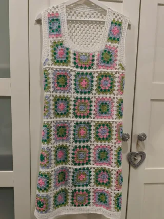 Vestido de crochet hecho a mano con el clásico diseño de granny squares. Es una prenda única y colorida. - Diseño de cuadrados. - Acabado calado. - Talla única. Medidas Hombros 38cm Sisa 44 cm Largo 94 cm