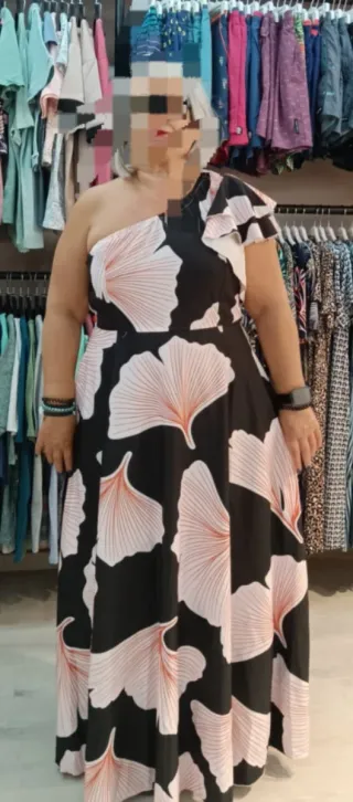 Precioso vestido largo con estampado floral en fondo negro. Cremallera lateral.(5foto) Tirantes tipo sujetador (ajustable)y volante que cae sobre el hombro. Queda muy bonito favorecedor y muy cómodo de llevar. Sisa:50cm. Largo desde debajo del pecho,(la linea que se ve en la foto) para abajo,1'07cm. A estrenar