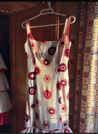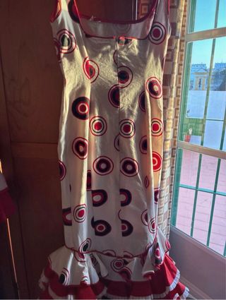 Vestido de flamenca con un diseño de lunares. - Diseño de lunares en círculos concéntricos. - Ribete en contraste en escote y bajo. - largo aprox. 1,40. - sisa 38 cm