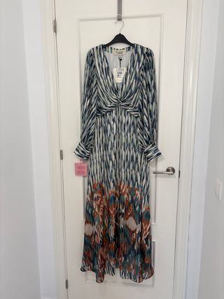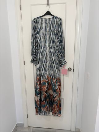 🔥 Vestido invitada NUEVO con etiqueta 🔥 Pedro del Hierro by Tamara Falcó – Talla XS – PVP 289€ Detalles de diseño: • Escote en V que estiliza la figura • Nudo cruzado en el pecho que realza la silueta • Manga larga fluida con puño ancho y tres botones forrados • Cremallera lateral invisible • Forro interior en blanco • Largo hasta el suelo, ideal para bodas y celebraciones de etiqueta 📐 Medidas: • Hombros: 32 cm • Pecho: 45 cm • Cintura: 35 cm • Manga: 60 cm • Largo total: 135 cm 📦 Envío inmediato y protegido 💬 Se valoran ofertas serias 🎁 Descuento por lote