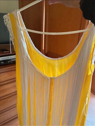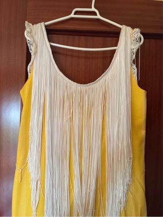 Vestido de flamenca de color amarillo y detalles de flecos. - Diseño con escote pronunciado. - Adornado con flecos blancos en la parte delantera. - Ribete de encaje en los tirantes. - Tejido con pequeños detalles de puntadas. - largo aprox. 1,32 - sisa 42
