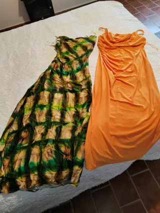 Dos vestidos largos, uno con estampado abstracto y otro liso. - Vestido con estampado tie-dye en tonos verdes y marrones. - Vestido liso en color naranja. - Tirantes finos ajustables.