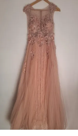 Elegante vestido largo con detalles brillantes. - Diseño con escote en V. - Adornado con pedrería y lentejuelas. - Falda fluida de tul.
