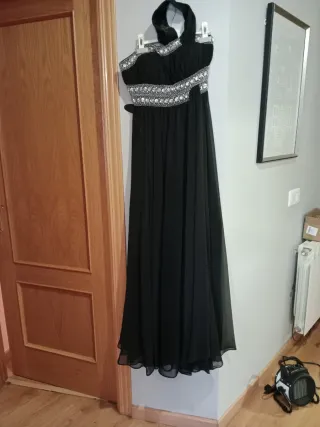 Elegante vestido largo de fiesta usado sólo en dos ocasiones: - Diseño con cuello halter adornado. - Cuerpo drapeado y falda fluida. - Cintura marcada con detalle fruncido.