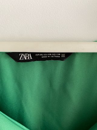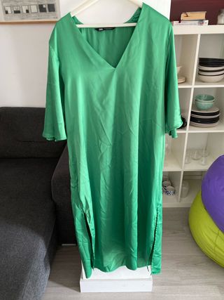 Vestido de color verde. Es ligero y fluido, con una caída elegante. Diseño asimétrico, más largo por detrás que por delante. Cintura elástica para un ajuste cómodo. Sin mangas. Talla L tiene un pequeño enganche y una pequeña mancha (se ve en las fotos) hecho en Italia una sola puesta