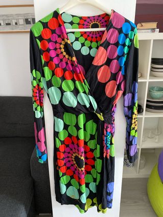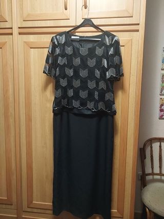 Vestido totalmente nuevo, muy original, de buena calidad y bonito. Mucho más bonito al natural y puesto!!! Lleva forro en todo excepto las mangas. Mide 45 cm de sisa a sisa. Debajo del pecho mide 40 cm, en cadera hasta 60 cm en cadera. De largo 1 metro. Lleva cremallera en el lateral izquierdo. Vale para M y L, fijarse en las medidas.