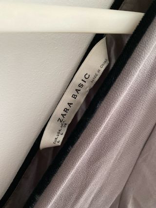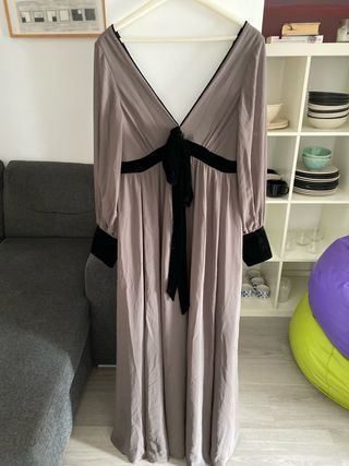 Elegante vestido largo de fiesta de Zara, ideal para eventos especiales. - Diseño con escote en V. - Detalle de lazo negro en la cintura. - Mangas largas con puños negros. - Combinación de colores gris y negro.